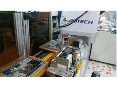 工藝流程:傳送帶將鎖附基底運送至待鎖附位,機器人收到信號進行 取螺絲, 取料后機械手運行至固定位置 進行鎖附。