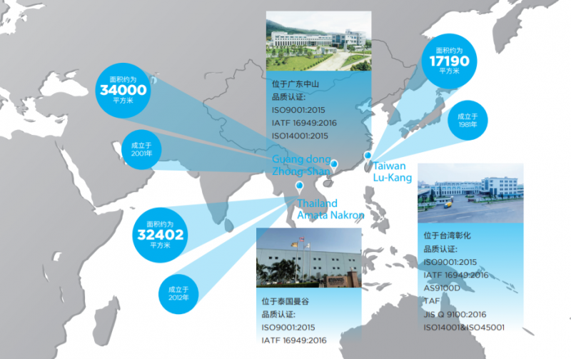 為掌握貿易優勢,繼茂橡膠自1986年成立以來分別在臺灣、大陸、泰國三地建置廠房,總面積約為83592平方米。品質認證包括ISO9001:2015、IATF 16949:2016、AS9100D、TAF、JIS Q