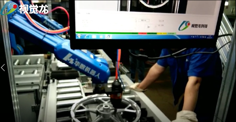 輪轂制造的機加工廠,以往的生產(chǎn)車間,一個個輪轂毛坯都是由人工搬運,放入和取出數(shù)控車床。現(xiàn)在都用機器人取代,上下料機器人與數(shù)控車床等智能裝備一起形成無人生產(chǎn)線,輪轂毛坯通過自動物流線運送到數(shù)控車床,本項目在加工過程中,華數(shù)機器人采用兩副手爪,一副送料,一副取料,同時為兩臺數(shù)控車床上、下料。通過視覺龍公司的VD200機器人視覺引導(dǎo)系統(tǒng)來識別60種不同的產(chǎn)品,根據(jù)不同的產(chǎn)品輸出模板序號、中心坐標和角度,華數(shù)機器人通過不同的序號調(diào)用程序進行打磨。
